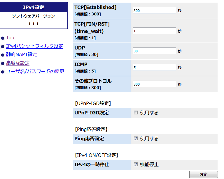 IPv4の一時停止の機能停止チェックボックが外れているので入れ設定をクリック確定